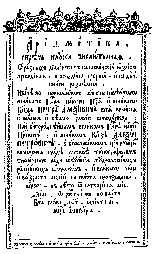 на котором написано киноварью: “Арифметика, сиречь наука числителная с разных диалектов на славенский язык переведеная и во едино собрана, и на две книги разделена”.