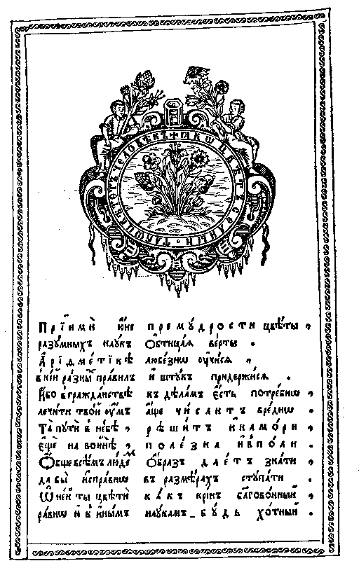 виньеткой со словами: “Тако цветет человек, яко цвет сельный”, вокруг геометрический рисунок, наверху двое юношей держат цветы. Под этим рисунком находятся стихи “К читателю юному” о важности учения арифметике как необходимой во многих областях жизни.