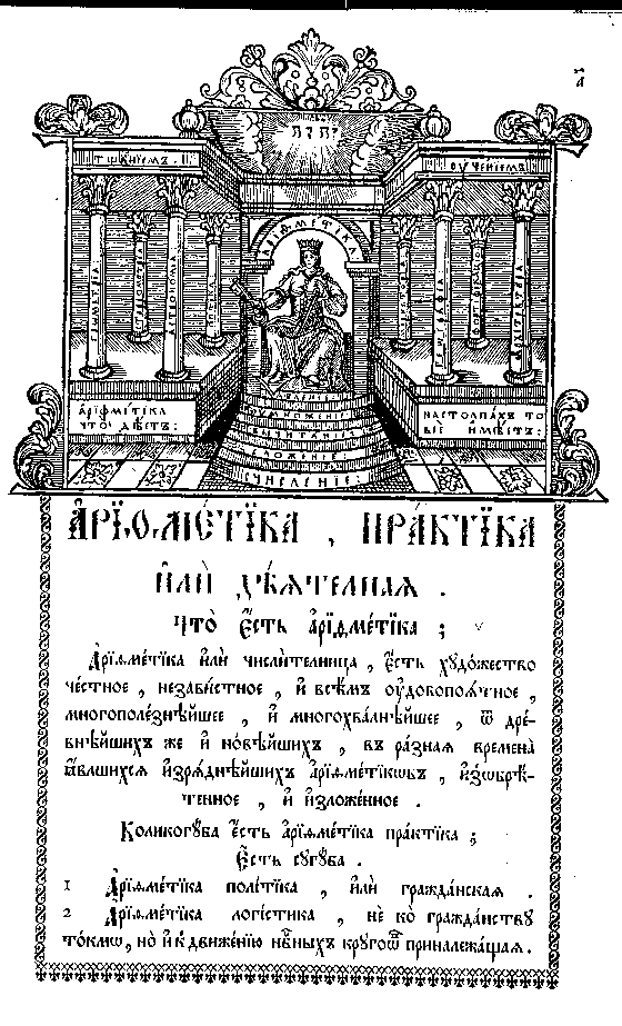 На ней дано аллегорическое изображение Арифметики в виде женщины в короне, сидящей на троне, под сенью, укрепленной на восьми “столпах”. В правой руке она держит ключ, левой – опирается на треугольник с цифрами. Трон стоит на возвышении, к нему ведут пять ступеней, на которых следующие слова (снизу): счисление, сложение, вычитание, умножение, деление. Вокруг трона на колоннах (“столпах”) с левой стороны от читателя: геометрия, стереометрия, астрономия, оптика; с правой – меркатория, география, фортификация, архитектура. В основании “столпов” слева: “арифметика что деет”; справа: “на столпах то все имеет”. Вверху на фронтоне в лучах – “ягве” – имя божие на иврите, ниже – изречение: “тщанием и учением”. Завершается гравюра лиственным орнаментом.