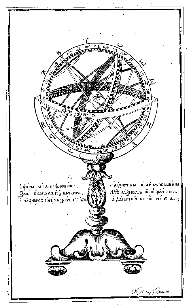 Следующую страницу книги занимает фронтиспис, гравированный на меди известным украинским мастером Михаилом Карновским, перешедшим работать в Москву. Его же работы на двух вклейках (после л. 224 и л. 282) – гравюры на меди: сфера мира (рис.5), под изображением награвировано шестистишие, и “роза ветров” (рис.6) – обе прекрасно выполненные.