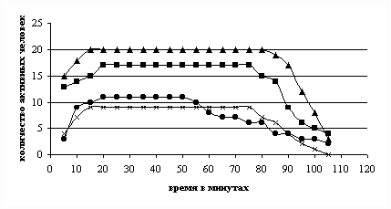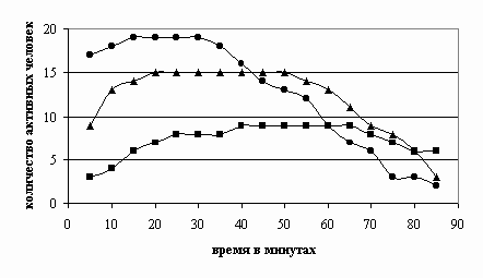 Результаты исследования дают оптимальную величину перерыва в пределах 12 - 17 минут. В случае более короткого перерыва резко изменяется картина снижения активности в течение второго занятия (на 30-й - 40-й минуте), в случае более длительной перемены продуктивная работа группы начинается слишком поздно (на 10-й - 20-й минуте), и то и другое при интенсивном изучении предмета недопустимо. Примеры, отвечающие за активность учащихся в зависимости от длины перемены представлены на рис.3. График отмеченный квадратными метками соответствует слишком длинной перемене (около 25 минут), круглые метки отмечают активнсть учащихся при коротком промежутке между занятиями (5-7 минут), а треугольные метки соответствуют оптимальной продолжительности перерыва.