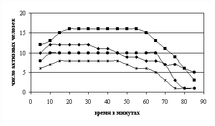 В течение занятия сторонним наблюдателем (воспитателем) фиксировалась активность учащихся (количество человек включённых в учебный процесс) через равные промежутки времени (5минут) в группах различной численности.