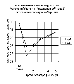 Более резкое изменение температуры кожи сразу после холодовой пробы у закаленной кожи сопровождается значительно большей скоростью ее восстановления. Такая активная реакция со стороны сосудистой системы при закаливании позволила подтвердить существование ее функционального резерва. Количественная его оценка может быть выражена как отношение разности температур "незакаленной" и "закаленной" кожи сразу после нагрузки к времени, необходимому для выравнивания температур.