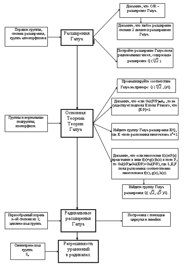 Наконец, вопросы, рассматриваемые в данном курсе, органично входят в программу курса “Алгебра и теория чисел”. Здесь активно используются и развиваются понятия, результаты, полученные в других разделах: линейная алгебра, теория чисел, теория многочленов. Например, такое математическое понятие как группа, впервые рассматриваемое на I курсе в разделе “Линейная алгебра”, здесь становится центральным объектом исследования. При решении ряда задач по теории групп активно используются знания, полученные студентами в рамках курса “Теория чисел” (III семестр). Раздел “Элементы теории Галуа” является логическим продолжением курса “Алгебра многочленов” (IV семестр). Таким образом, чтение обсуждаемого курса позволяет повторить и закрепить ранее изученный материал.
