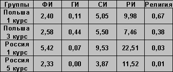 Если сравнить группы поляков и русский, то можно отметить следующее. В старших группах (студенты выпускных курсов) примерно одинаковые показатели идентичности по всем параметрам, кроме религии. У русских несколько выше рефлексивное Я и практически отсутствуют ответы, выражающие принадлежность к широкой группе мирового сообщества. Структуру идентичности польских студентов определяет и религия, показатель этой идентичности даже выше, чем гражданский. Нам показалось странным, что среди опрошенных русских студентов этот показатель приближается к нулю.